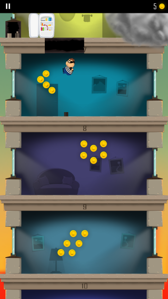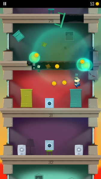 游戏开始时,玩家将看到一个充满活力的主界面,可以选择调整语言设置。正式游戏后,老爸会出现在摩天大楼的最顶层,玩家需要通过上下滑动屏幕来控制老爸的行动。向下滑动可以让老爸撞穿地板快速下降,向上滑动则能让他跳跃躲避障碍。在下降过程中,玩家需要时刻注意躲避巡逻的警察、飞弹等危险,同时还要收集散落的金币和各种实用道具。随着楼层不断下降,游戏难度会逐渐提升,考验玩家的反应速度和策略能力。