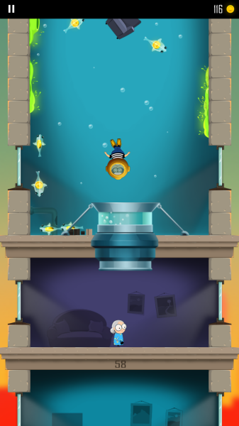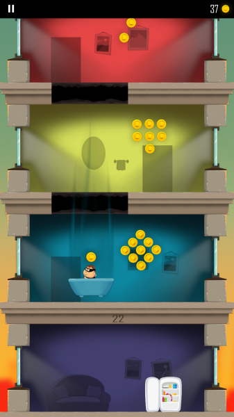 游戏采用极简的操作方式,仅需上下滑动屏幕就能完成所有动作,让玩家可以轻松上手。可爱的卡通画风是游戏的一大亮点,胖乎乎的老爸角色造型生动有趣,奔跑时的滑稽动作总能逗人发笑。游戏提供了丰富的道具系统,包括可以加速下降的浴缸、提供保护的冰箱等,为游戏增添了更多变数。同时,各种精心设计的障碍物如激光陷阱、飞弹等,为游戏带来了足够的挑战性。此外,游戏中还隐藏着许多秘密通道和捷径,等待细心的玩家去发掘。