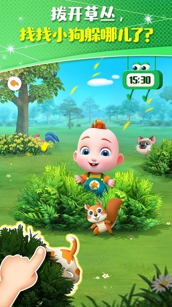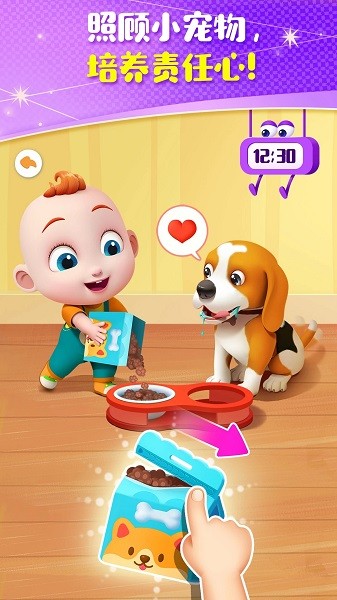 在宠物照顾环节,孩子们会遇到可爱的小狗Bingo。当听到"汪汪"的叫声时,说明Bingo饿了,这时小朋友需要帮忙喂食:先撕开狗粮包装袋,然后将狗粮倒入宠物餐盆中。如果Bingo看起来还是没吃饱,小朋友还可以使用开罐器为它打开一个美味的宠物罐头。通过这个互动环节,孩子们不仅能学习照顾小动物的方法,还能培养责任心和爱心。