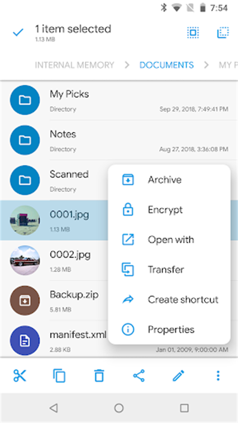 长按文件可调出更多操作选项,如重命名、分享等