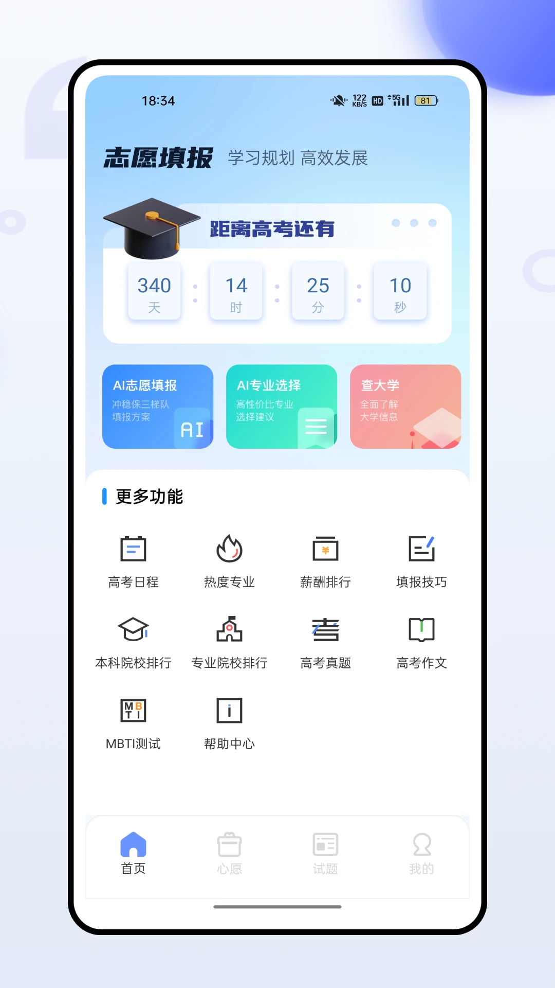 一款高考志愿的应用,主要功能查大学:用户可以通过输入院校名称,查询该大学的详细信息,包括学校简介、历年分数线、招生计划、往年考生口碑等,帮助考生了解目标院校。