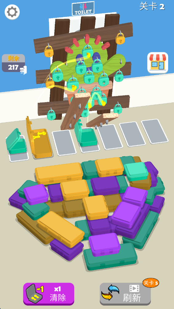 每个盒子内部都藏有五把不同颜色的钥匙,这些钥匙与场景中的彩色锁具一一对应。玩家需要合理移动盒子,让钥匙与锁具的颜色完美匹配,才能成功解锁。