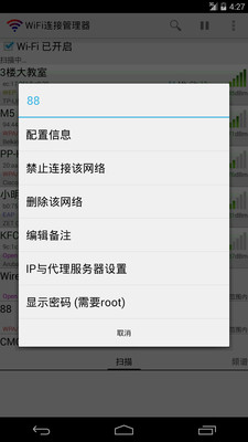 搜索网络:启动WIFI连接管理器后,软件会自动扫描周边环境中的无线网络信号,并以清晰直观的列表形式展示给用户。用户可以根据网络名称、信号强度、加密类型等信息快速筛选出最适合的网络。
