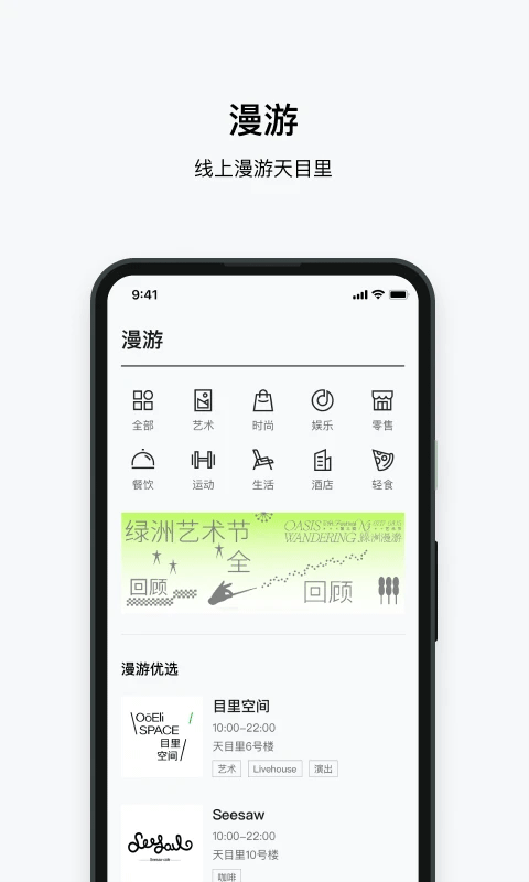 「漫游」功能带领用户探索天目里的每一个精彩角落,从美术馆、画廊到特色书店,从私密影院到户外放映,从Livehouse音乐现场到精品酒店,每一处都藏着独特的美好等待发现;