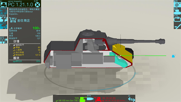 在装甲检查员官方正版游戏中,玩家可以体验到丰富多样的创意玩法。游戏采用直观的操作方式,即使是新手也能快速上手。玩家可以自由调整坦克的角度,全方位欣赏3D模型的细节,包括坦克装甲、撞击效果、炮弹穿甲程度以及纹理等各项数值。通过这些功能,玩家能够清晰地了解坦克的各项数据,包括装甲防护能力、弹药穿透力以及模块位置等重要信息。此外,玩家还可以选择不同的射击坦克和目标坦克,计算射击距离和伤害值,学习如何精准命中目标,掌握进阶技巧,在充满挑战的游戏世界中展开一场刺激的冒险。