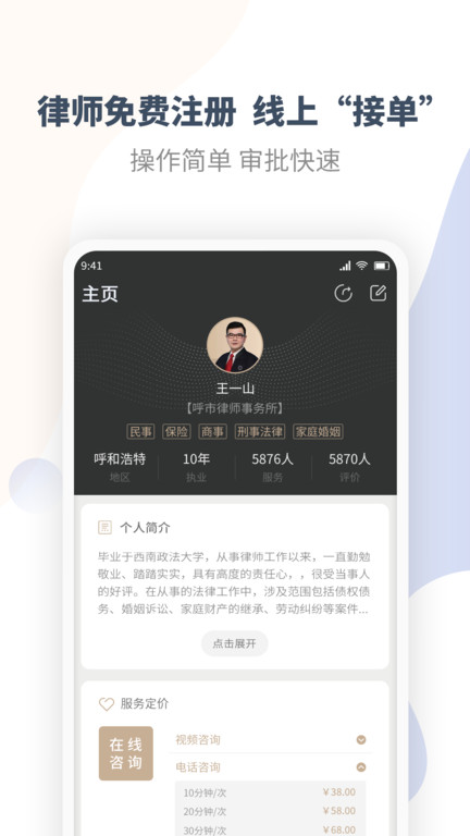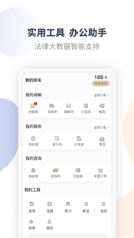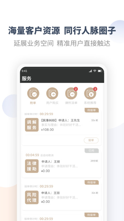 ·提供了多种接单途径,包括抢单、用户购买、律所派单、系统推荐等类型,满足不同律师的工作需求。