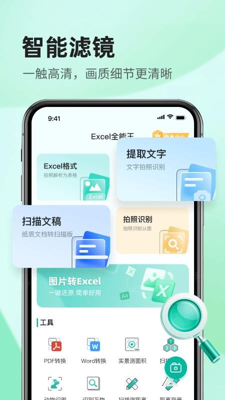 Excel全能王APP是一款功能全面且高效的文档处理工具,它将扫描识别、文字提取、格式转换和测量工具完美整合,为用户提供一站式办公解决方案。无论是日常文档处理还是复杂的数据整理,这款应用都能轻松应对,大幅提升工作效率。其强大的核心功能包括智能表格转换、高级文字提取以及多功能测量工具,满足不同场景下的多样化需求。