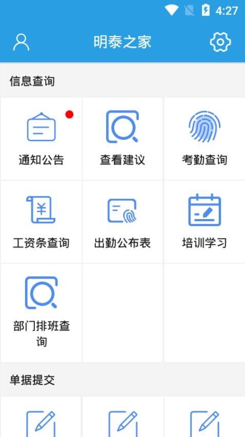 应用功能方面,明泰之家APP提供了全方位的办公支持。信息查询功能让用户能够随时查阅所需的工作资料;多样化的查询类型满足不同岗位员工的需求;考勤数据模块可详细展示近七天的出勤记录;智能筛选功能帮助快速定位特定日期的考勤信息;实时通知系统确保重要公告及时送达;单据提交功能简化了各类申请流程,让办公更高效。