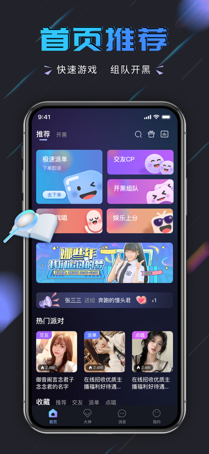 趣开黑不仅是一款语音开黑工具,更是一个充满活力的游戏社交生态圈。作为当下最火爆的语音组队平台,这里汇聚了来自全国各地的游戏达人、技术大神和声音甜美的陪玩小姐姐。平台独创的"天降大神"系统,会随机为您匹配免费的游戏高手带队开黑,彻底解决"找不到靠谱队友"的烦恼。无论您是想要提升段位,还是单纯享受游戏乐趣,趣开黑都能为您带来前所未有的开黑体验。