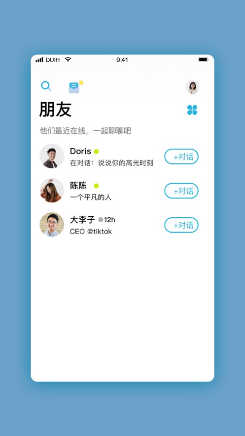 《对话吧》是一款简单清爽、广受欢迎的社交软件,专为寻找志同道合朋友或开启一段缘分的用户设计。在这里,你可以轻松结识有趣的小伙伴,享受便捷的聊天体验。无论是想分享生活点滴,还是寻找心灵共鸣,对话吧都能满足你的需求。软件提供一键查看好友信息、即时沟通等功能,让交友变得更加简单高效。无论你是社交达人还是初次尝试线上交友的新手,都能在这里找到属于自己的社交圈。感兴趣的小伙伴千万不要错过这款充满活力的社交平台!
