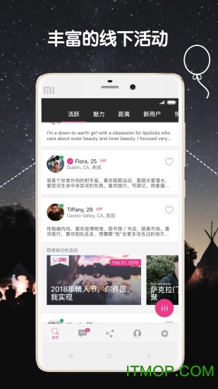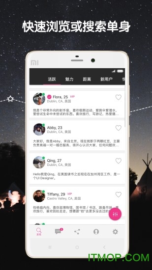 免费每日推荐优质单身异性,根据你的喜好智能匹配理想对象;免费搜索、浏览上百万海外华人资料,扩大你的交友圈;免费与心仪对象互动,通过抛媚眼和搭讪功能打破初次交流的尴尬;个性化搜索功能让你快速筛选符合条件的人选;定期举办丰富多彩的线下活动,为单身人士创造面对面交流的机会;与任何喜欢的人自由聊天,不受限制地表达心意。两颗红豆致力于为你提供全方位的婚恋服务体验。