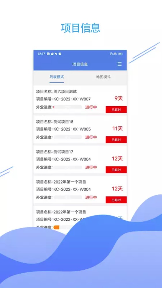 项目管理:在"项目信息"模块可切换列表或地图模式,直观查看项目编号、外业进度及剩余天数等关键信息。地图模式支持多点标注和区域筛选,便于项目整体把控。