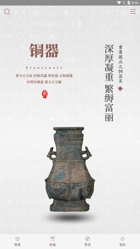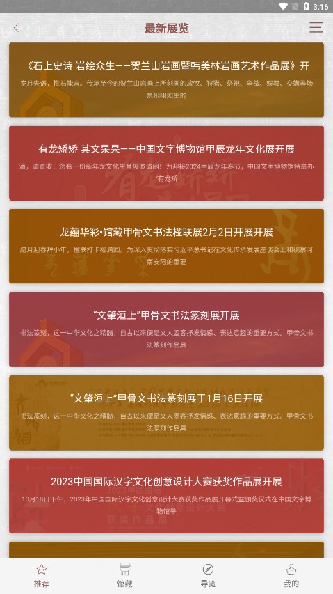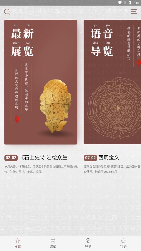 中国博物馆app是一款功能强大的博物馆综合服务平台,致力于为用户提供全方位的博物馆信息服务。作为连接用户与中国文字博物馆的桥梁,这款app不仅能够实时推送最新资讯动态,还能让用户深入了解丰富的馆藏文物,享受专业优质的导览服务。中国文字博物馆作为国内重要的文化机构,通过该平台实现了各类信息的数字化呈现,让用户足不出户就能掌握博物馆的第一手资料。