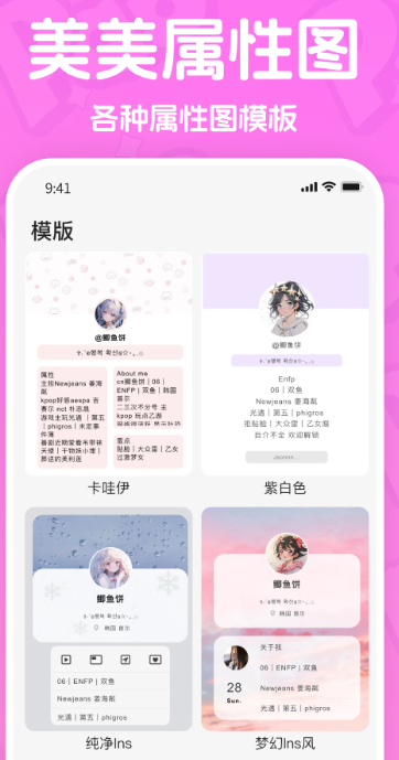 这款应用最突出的特点在于其强大的视觉定制能力。它内置了多功能视觉风格库,不仅包含ins风、卡通人物等热门模板,还持续更新最新潮流元素,完美满足不同用户的审美需求。用户可以自由编辑模板中的文本内容,个性化调整"属性"、"Aboutme"等板块信息,打造专属的个人名片。更令人惊喜的是,它支持全方位的视觉元素自定义,包括背景颜色调整、背景图片替换、字体样式选择、文字颜色修改等,让每张属性图都成为独一无二的艺术品。