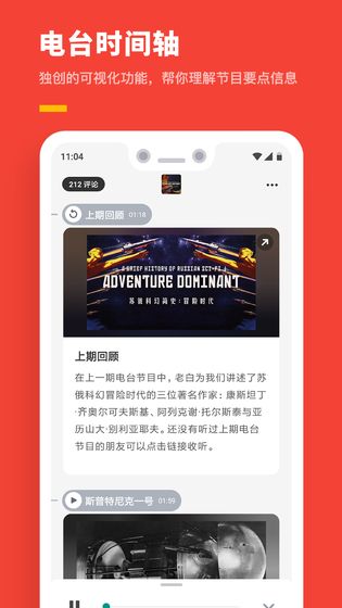 【电台时间轴】我们为GADIO电台节目(曾3次获得iTunesPodcast年度节目推荐)特别设计了时间轴功能,将节目中的关键信息以图文形式呈现,让用户在收听的同时能够直观了解内容要点,提升收听体验。这一创新设计让电台节目变得更加生动有趣。