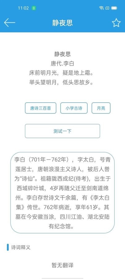 1、优化了搜索算法,提升搜索准确率和响应速度;2、新增了"我的学习报告"功能,可视化展示学习进度;3、修复了部分设备上音频播放异常的问题;4、改进了UI设计,提升用户体验;5、新增了30首经典诗词及详细解析。