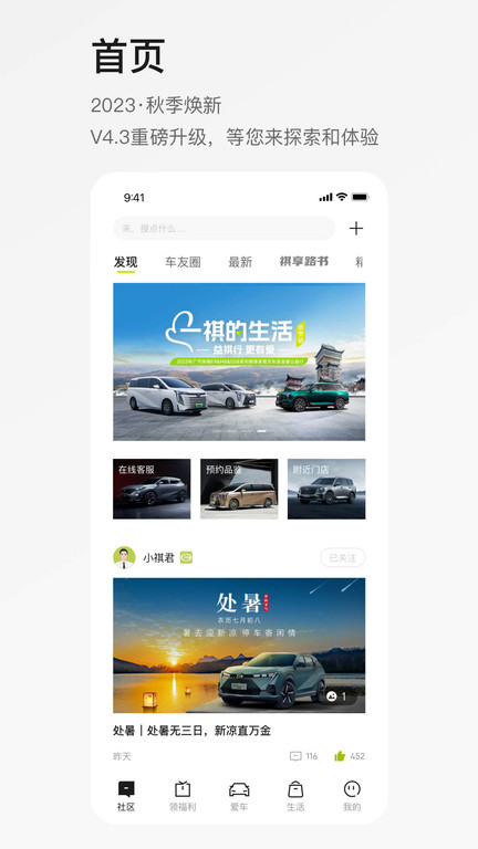 v4.3.1版本 新增传祺生活专区,定期更新精品好物;支持E9插电混动MPV线上预订,提供多种金融权益。