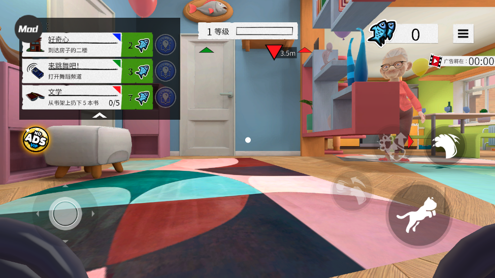第一个新手任务是熟悉游戏中的主要场景。玩家需要控制自己的猫咪角色,通过点击屏幕上的楼梯图标,让猫咪优雅地爬上二楼。在移动过程中,玩家可以尝试点击场景中的各种互动元素,比如可以抓挠的沙发、可以跳上去的窗台等,这些都会增加游戏的趣味性。