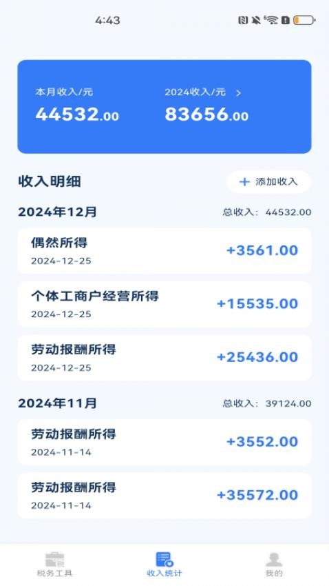 智能统计功能可自动汇总用户的月度、年度收入情况,生成直观的图表展示。系统会根据收入类型自动计算应纳税额,并提供历史数据对比功能,帮助用户更好地规划财务收支。