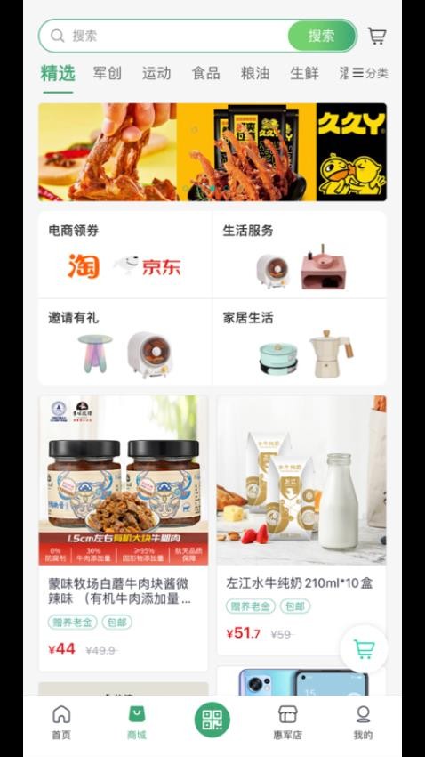 商品种类丰富,涵盖食品、日用品、电子产品、军创产品等多个类别。特别是军创产品专区,汇集了众多退役军人创业项目产品,支持战友事业发展。