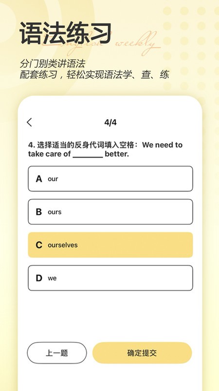 语法教学——系统化的语法知识讲解,配合针对性练习,让您轻松实现语法查、学、练一体化。掌握语法规则,就等于掌握了英语学习的金钥匙。