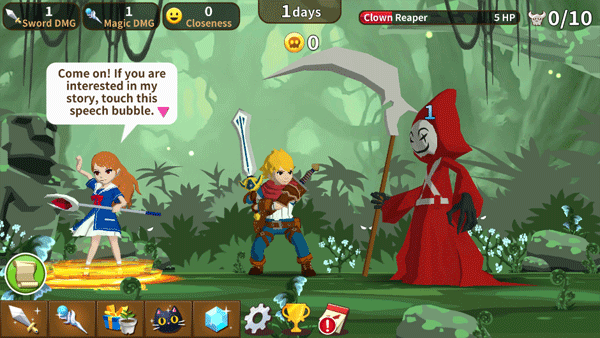 进入到游戏主界面,会看到魔族公主和勇者,玩家将作为勇者去打败那些怪兽,通过不断点击怪兽来攻击它,给它输出伤害。注意观察怪物的攻击模式可以更好地进行闪避。在攻击怪兽的过程中,可以查看上方的血条,如果怪兽的血条快没有了,那么就可以将怪兽打倒了,此时可以积攒能量释放必杀技。当怪兽被打败时,身上会掉下金币,要根据怪兽的血条程度来掉相应的金币数量,精英怪还会掉落稀有材料。获取到的金币可以购买一些工具来增加攻击力,从而更快地打败怪兽,建议优先升级武器和防具。