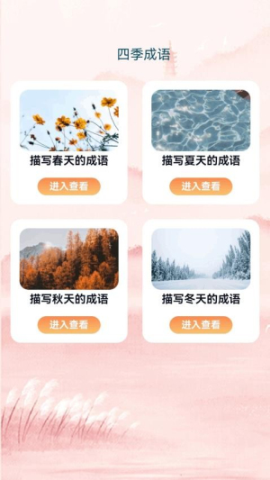使用榜眼猜成语非常简单直观。首先,用户需要点击同意按钮进入应用程序,映入眼帘的是一个设计精美、操作便捷的界面,让人立刻就能进入学习状态。接着,用户可以根据自己的学习需求,选择感兴趣的季节分类进行成语学习,这种分类方式让学习更有条理性,也更容易记住与季节相关的成语。最后,点击开始答题按钮,就能进入趣味盎然的成语挑战环节,通过答题来检验学习成果,同时享受知识带来的乐趣。