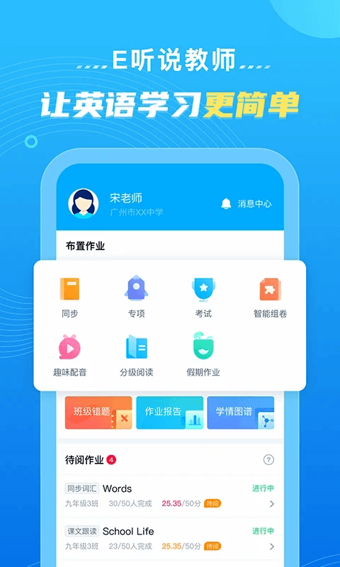 E听说教师是由广州讯飞易听说网络科技有限公司专为教师群体精心打造的一款智能化教学管理软件。作为教师教学工作的得力助手,该软件集班级管理、作业布置、学情分析等多项功能于一体,帮助教师轻松实现信息化教学。通过这款软件,教师可以一键下发各类作业任务,在线布置听说读写全方位练习,系统自动完成智能评分,还能导出学生录音讲评包,满足不同教学场景需求,真正实现个性化、精准化的教学管理。