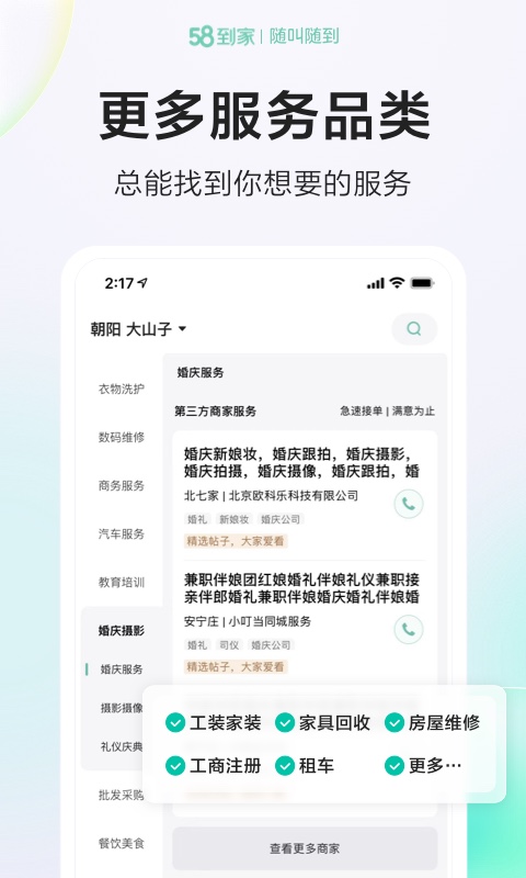 58到家还提供多种生活便民服务,如洗衣洗鞋、开锁换锁、租车、保健按摩和上门安装等,让您的日常生活更加便利。作为平台的服务亮点,58到家精选优质服务商,严格把控服务质量,确保每一位用户都能享受到放心、满意的服务体验。我们致力于通过专业的服务团队和严格的质量标准,让您的生活更加简单美好,让每一个家庭都能享受到高品质的生活服务。