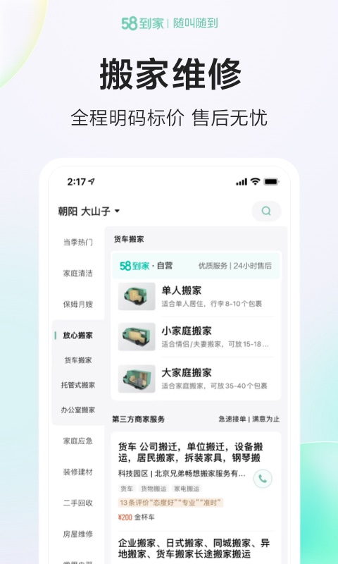58到家,作为全国领先的生活服务平台,致力于为用户提供全方位、高品质的生活服务解决方案。平台汇聚了百余类专业服务项目,涵盖家庭日常所需的方方面面,从基础的保洁清洗到专业的家电维修,从贴心的保姆月嫂到便捷的搬家速运,58到家都能为您提供专业、优质、有保障的一站式服务体验。无论您遇到什么样的生活难题,只需一个电话或在线预约,我们的专业服务团队就能随叫随到,为您解决生活中的各种小麻烦,让您的生活更加轻松无忧。