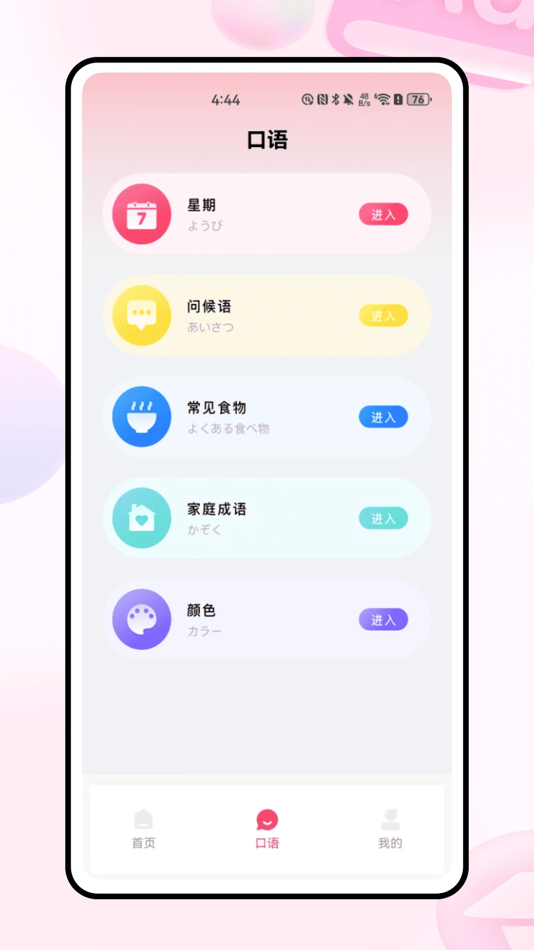 日语翻译官是一款专为日语学习者打造的单机学习应用,首页集成片假名、平假名基础教学与罗马字对照功能,助力系统掌握日语假名体系;口语模块按食物、家庭、颜色等生活场景分类,提供实用口语训练素材。应用无需联网,数据本地加密存储,兼顾隐私与便捷性。界面简洁直观,支持离线学习,是日语初学者夯实基础、练习日常对话的高效工具。