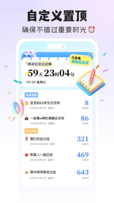进入app就能直观查看所有记录事件,通过拖拽功能轻松调整事件排序,让重要事项优先显示。系统内置丰富的分类标签,从工作到生活,从个人到家庭,帮助用户快速区分不同性质的事项。新建事件提醒操作简单快捷,只需几步就能完成重要日子的记录。特别设计的"时光信箱"功能,让你可以给未来的自己写信,记录当下的心情与期许,为未来增添一份惊喜。