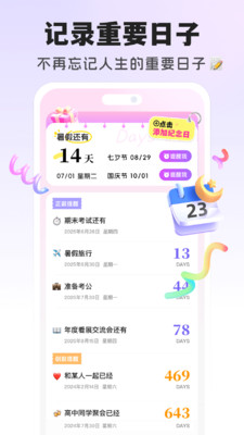 倒计时DayCountersapp是一款专为记录人生重要时刻而设计的智能时间管理工具。它不仅能帮你精准记录生日、纪念日等特殊日子,还能通过个性化设置让每个重要事件都充满仪式感。用户可以自由上传照片作为事件背景,打造专属记忆空间。强大的日期计算功能让你轻松掌握时间间隔,灵活设置重复提醒确保不会错过任何重要时刻。无论是工作规划还是生活纪念,这款app都能成为你贴心的时光管家。