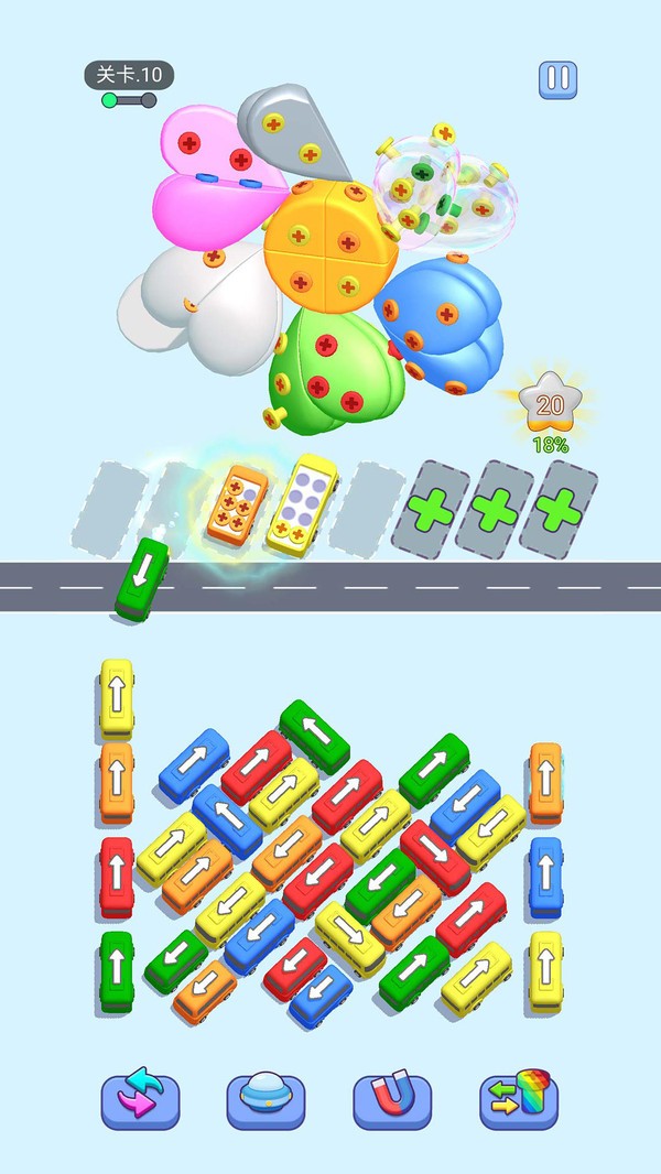 在游戏过程中,玩家需要特别注意车辆的装载顺序。只有当车辆装满螺丝后,才能继续添加其他车辆。如果遇到停车位不足的情况,可以花费金币解锁新的停车位,为战略部署创造更多可能。
