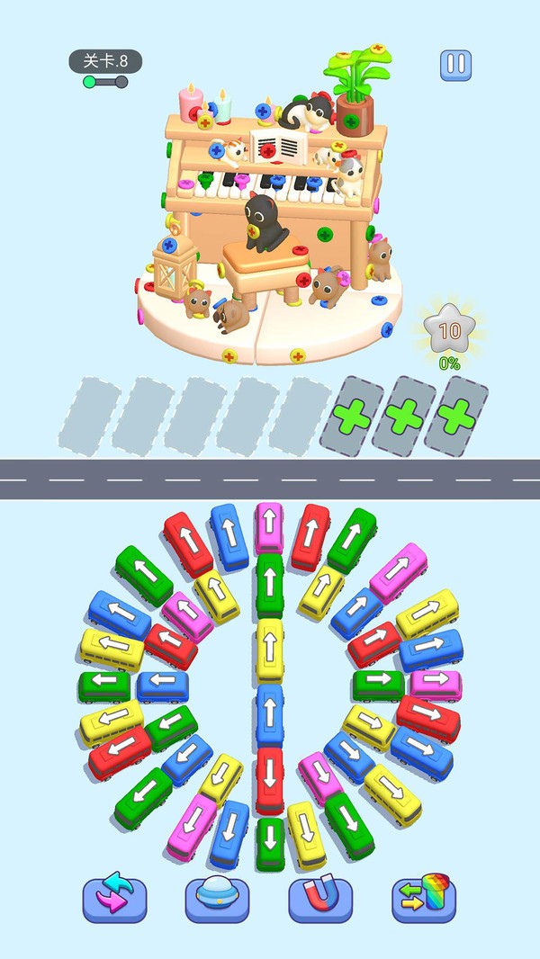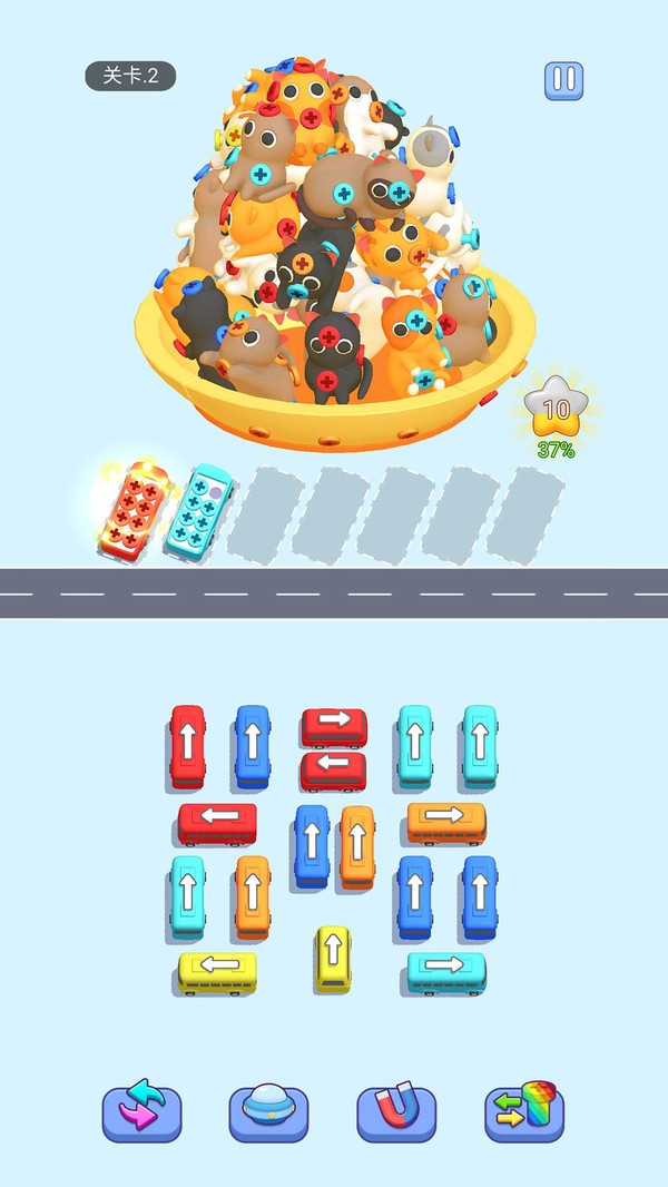 游戏提供丰富的辅助道具系统,玩家可以修改车辆颜色来快速匹配螺丝,大大提升解谜效率。同时,游戏还支持灵活的车辆调度功能,玩家可以自由选择任意车辆移动到指定位置。