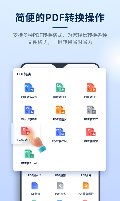 软件还支持将Word、Excel、PPT和JPG图片等格式快速转换为PDF文件,转换后的PDF文件保持原文档的排版和格式,确保文件在不同设备上显示一致。无论是办公文档还是图片资料,都能一键转换为高质量的PDF文件,方便存储和分享。