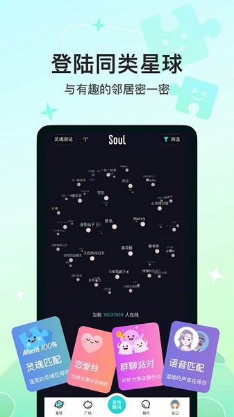 这款软件最吸引人的地方在于它独创的"灵魂鉴定"系统,通过30秒的趣味测试,帮助你更深入地了解自己,并基于七维动态数据模型,精准匹配与你心灵契合的伙伴。告别传统社交软件"看脸"的局限,Soul让你能够以最真实的状态与他人交流,发现那些真正懂你的人。