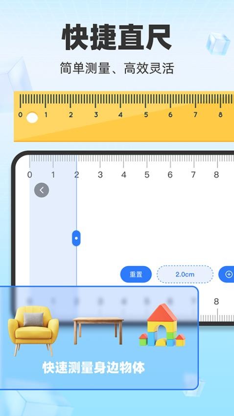 利用手机屏幕作为虚拟测量标尺,通过智能图像识别技术准确测量物体的长宽尺寸,支持厘米、英寸等多种单位显示。