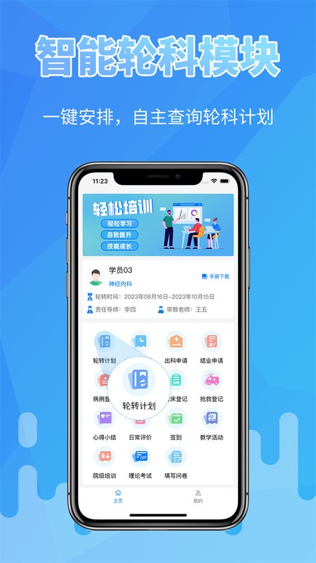 学员功能包括:查看个人轮转计划、提交请假申请、办理出科手续、完成结业申请、登记临床病例、记录技能操作、管理床位信息、上报抢救病例、撰写学习心得、接收日常评价、在线签到、参与教学活动、完成日常考核、填写调查问卷、下载培训手册等全方位学习管理功能。