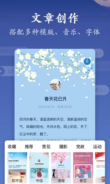 黑底白字的文字太枯燥?美篇可以给你的文章加上模版、配上音乐、换种字体。节日、生活、亲子、旅行、商务等海量模版样式,热歌、经典老歌、轻音乐、氛围配乐,千万首各种风格的音乐曲库,满足你的各种文章场景。平台每周更新设计师原创模板,紧跟流行趋势,让您的作品始终保持新鲜感。