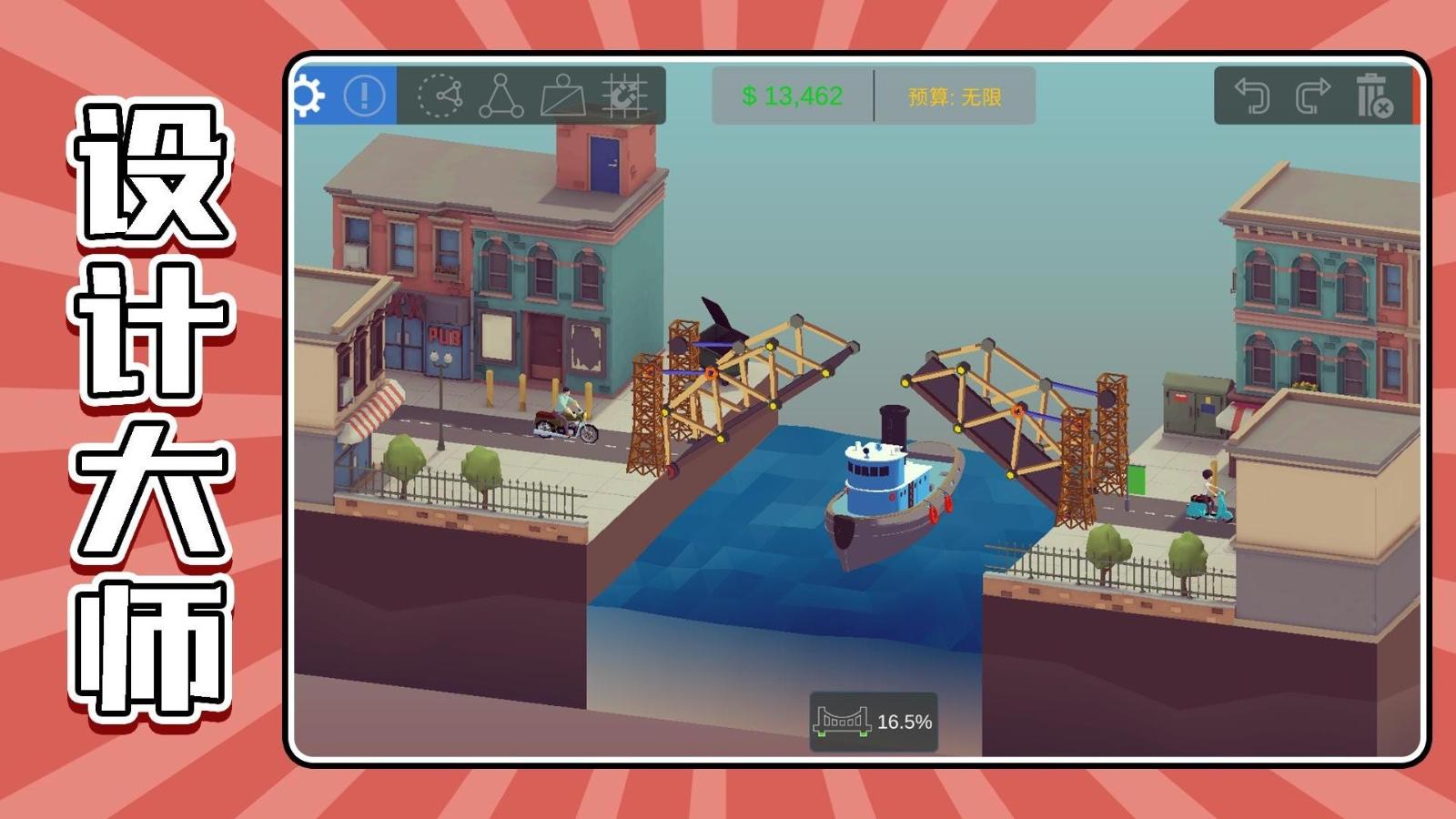 游戏初期会提供详细的建造教程,建议新手玩家仔细观看教学动画。首先在材料选择界面点击右侧工具栏中的木板与绳索,系统允许同时选取三种基础配件进行组合,不同材料的搭配会直接影响桥梁的承重性能。在河面上方通过滑动手指来拼接建筑材料时,要特别注意桥梁的整体倾斜角度,当结构显示红色警告标识时,说明当前设计存在安全隐患。完成初步搭建后,点击屏幕左下角的测试按钮,观察车辆行驶时的桥梁受力情况,若出现裂缝要及时点击修复。成功抵达对岸后,系统会根据桥梁的剩余耐久度给予星级评价,这些评价将直接影响后续关卡的解锁进度。