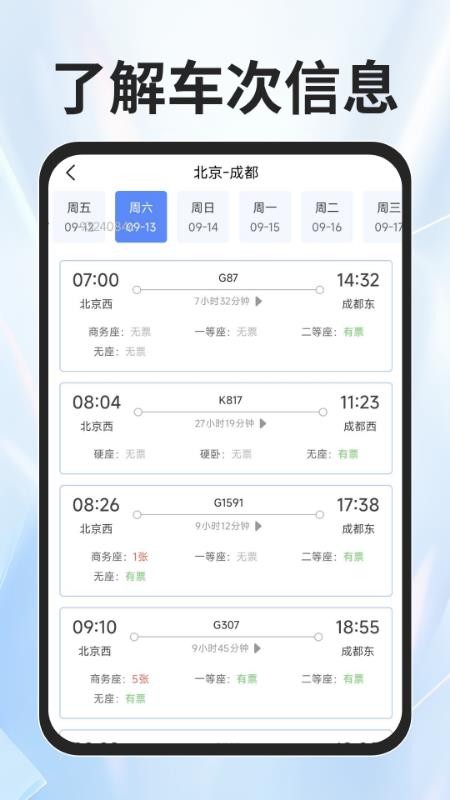 详细的车次信息,在应用中可详情了解,知道每天车次车票,便于选择性预订;支持车次对比功能,帮助用户选择最优出行方案。