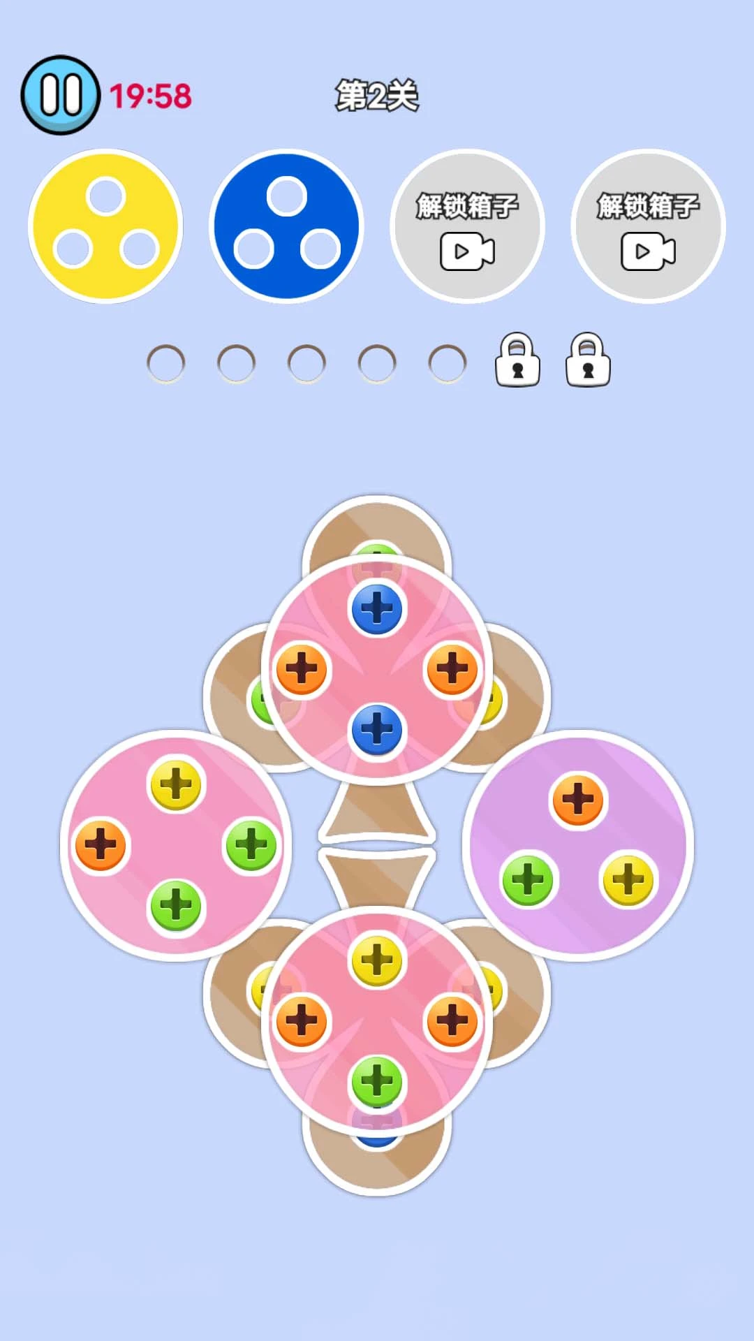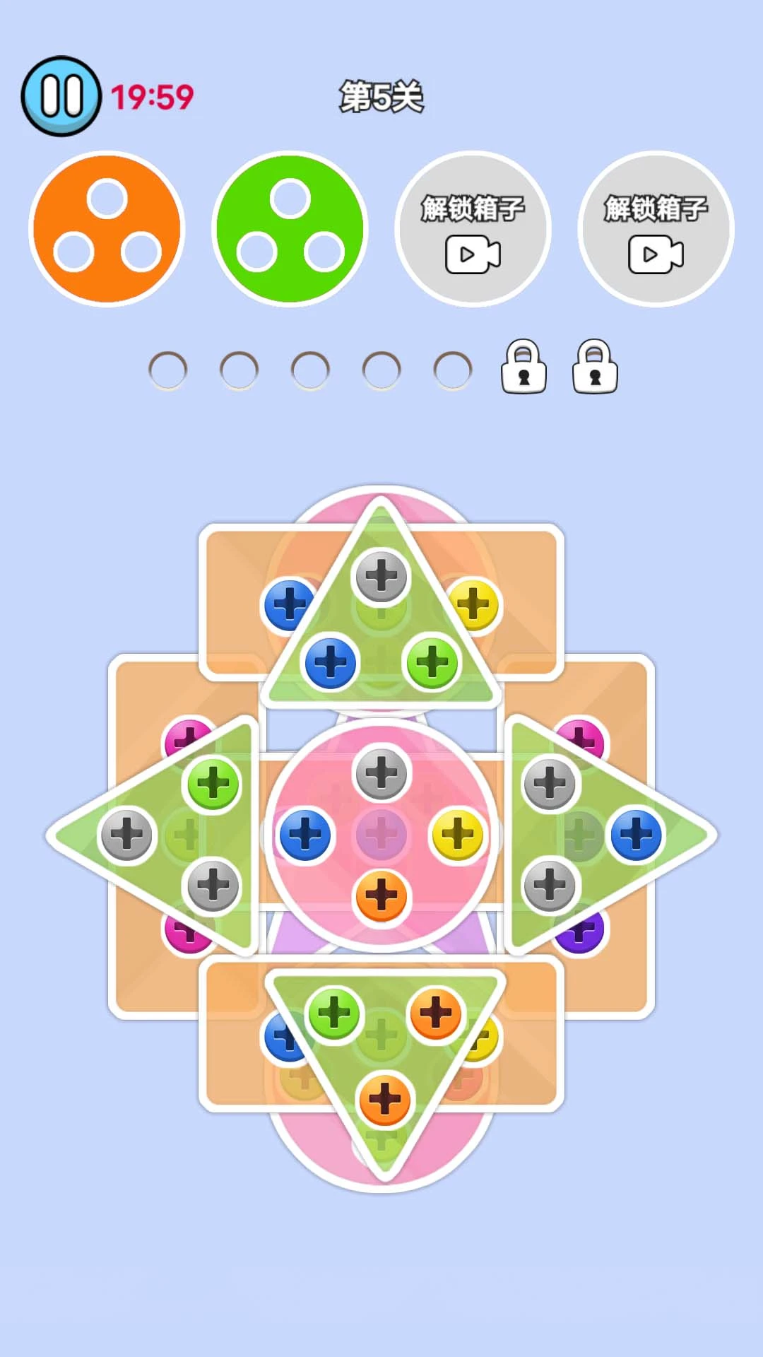 开开心心拧螺丝,欢欢喜喜来消除欢迎来到开心拧螺丝,游戏画风可爱简单,玩法经典不过时,操作非常简单,只需要动动手指点击屏幕螺丝,每三个一组就可以消除,当你把页面所有螺丝消除完毕就游戏就通关了,每个关卡都有不同的图形安排,给你不一样的体验关卡多多,难度慢慢升级道具超多,让你更快通关图形超赞,带给你不一样的视觉感受