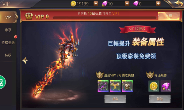 至尊卡福利:尊享无限返利、神装碎片、专属称号、双倍成长速度和超大背包空间等特权;