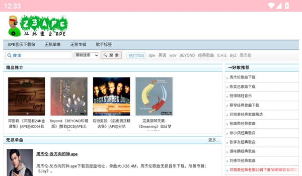 23APE音乐app是一款专为音乐发烧友打造的高品质音频播放平台,以APE无损音乐格式为核心特色,同时完美兼容FLAC、WAV等多种无损音频标准。软件拥有庞大的华语音乐资源库,收录了周杰伦、五月天、谭咏麟、张学友等众多实力派歌手的经典作品,从怀旧金曲到最新热门单曲一应俱全。用户可以根据个人喜好自由选择单曲试听或整张专辑下载,随时随地享受纯净无损的音乐盛宴。简洁直观的界面设计和无广告干扰的播放环境,让音乐体验更加纯粹专注。