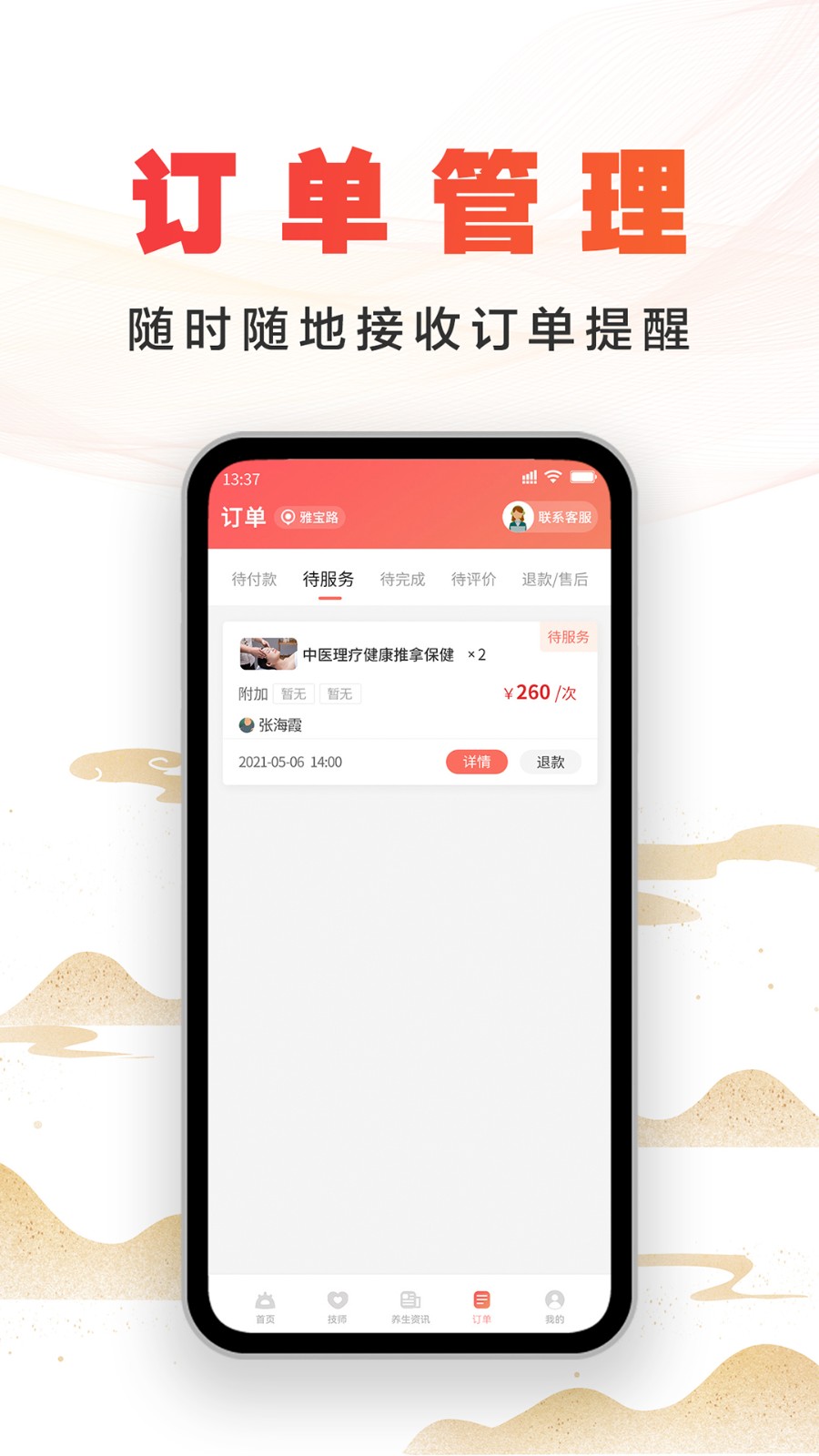 点击"订单"可查看当前待服务、待付款、待完成等不同状态的订单,商家可随时查看订单详情并进行接待或取消。支持按时间、金额等多条件筛选查询历史订单。