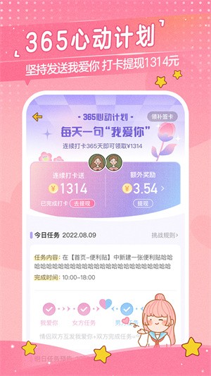 心动日常提供优质的互动体验,让用户轻松记录恋爱中的重要日子。软件帮助情侣共同见证感情发展,保存美好回忆。丰富的互动游戏和挑战任务,让情侣在玩乐中增进感情,体验独特的爱情之旅。无论是日常记录还是特殊互动,心动日常都能为情侣提供独特的恋爱体验。