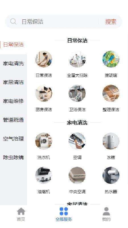 通过全部服务板块,可选择日常保洁、家电清洗、维修及管道疏通等家政项目。用户可以根据自身需求筛选服务类型,查看服务详情和价格,方便做出最佳选择。