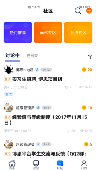 参与的班级和教师陈列出来,便于查看班级上课状态,直观的界面设计让用户一目了然;热门话题极速阅览,明确看到i博思讨论的社区动态,智能算法推荐用户感兴趣的内容;移动教室学习更轻松,不需要任何的限制就能学习课程,支持离线下载功能;待办任务实时提醒,智能推送系统确保用户轻松掌握自己需要处理的任务数据,避免遗漏重要事项。