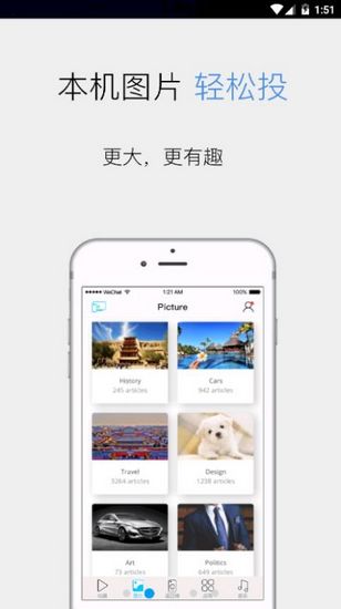 本地投屏功能:支持手机本地存储的音乐、视频、图片和文档一键投屏,操作简单快捷。